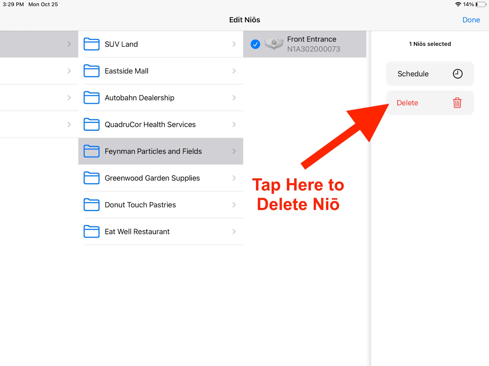 IMPORTANT: If a Niō was previously set up at another geographic location, it should be deleted before it can be set up again. Deleting a Niō requires privileges at at-least the manager level. The deletion does not affect any recordings the Niō had made. Previously registered users of the Niō will not be affected other than to have the instance appear offline.