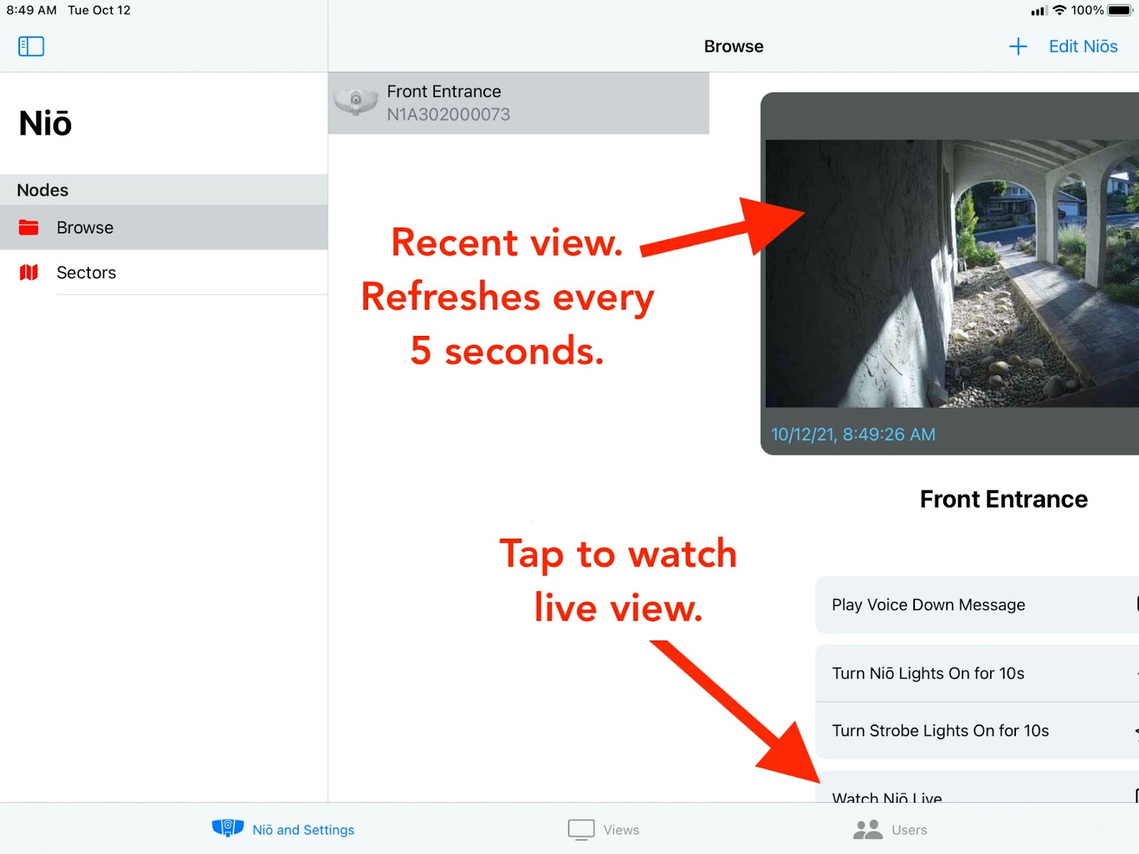 In the iDter app, in the Niō and Settings tab, open the company folder and tap the name of the Niō you’d like to view. You will see the view from the camera, refreshed every five seconds. Scroll down and tap the button that says Watch Niō Live to view the live feed.