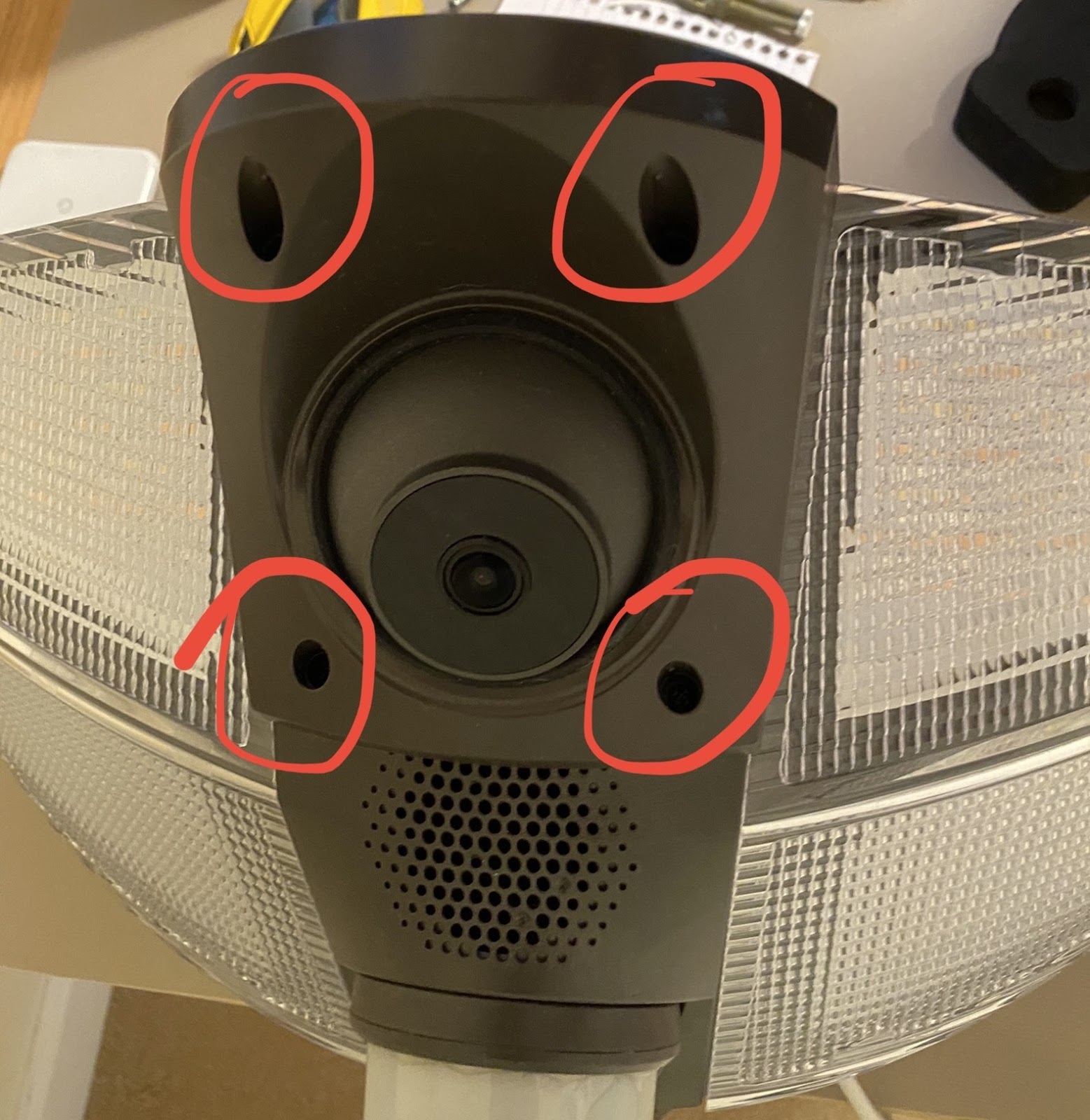 There are four screws around the camera case, shown below, that help keep the visor in place. Make sure these screws are loose before moving the camera ball. This will help protect the weatherproof seal and make it easier to move.