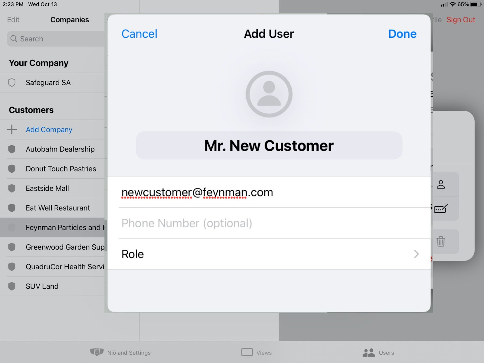 Select Done to add the user to this company and send them an iDter welcome email. The new user will now appear in the list of users at that company. If you need to, you can edit their information (name, phone number, or role), reset their password, or remove them.