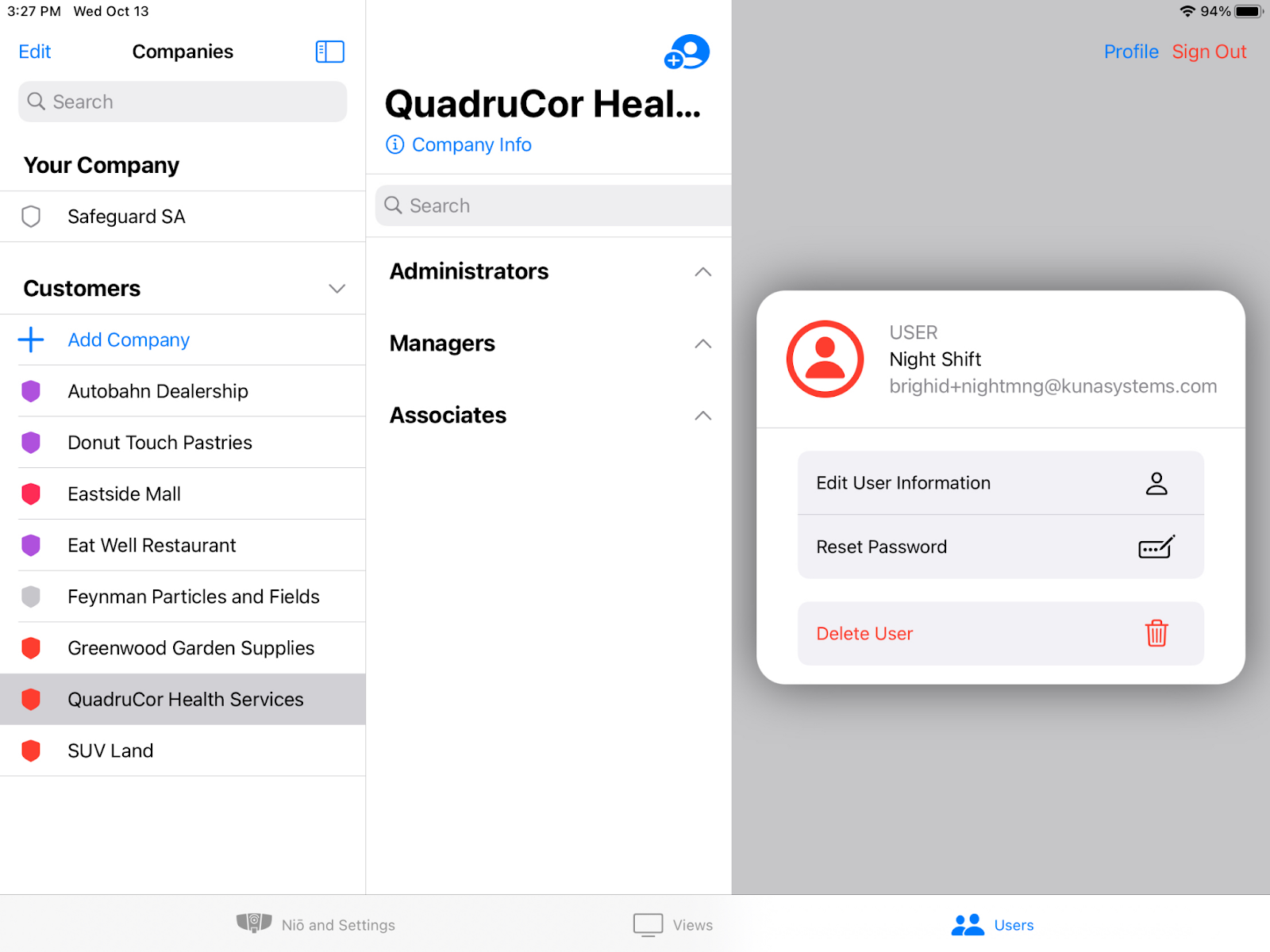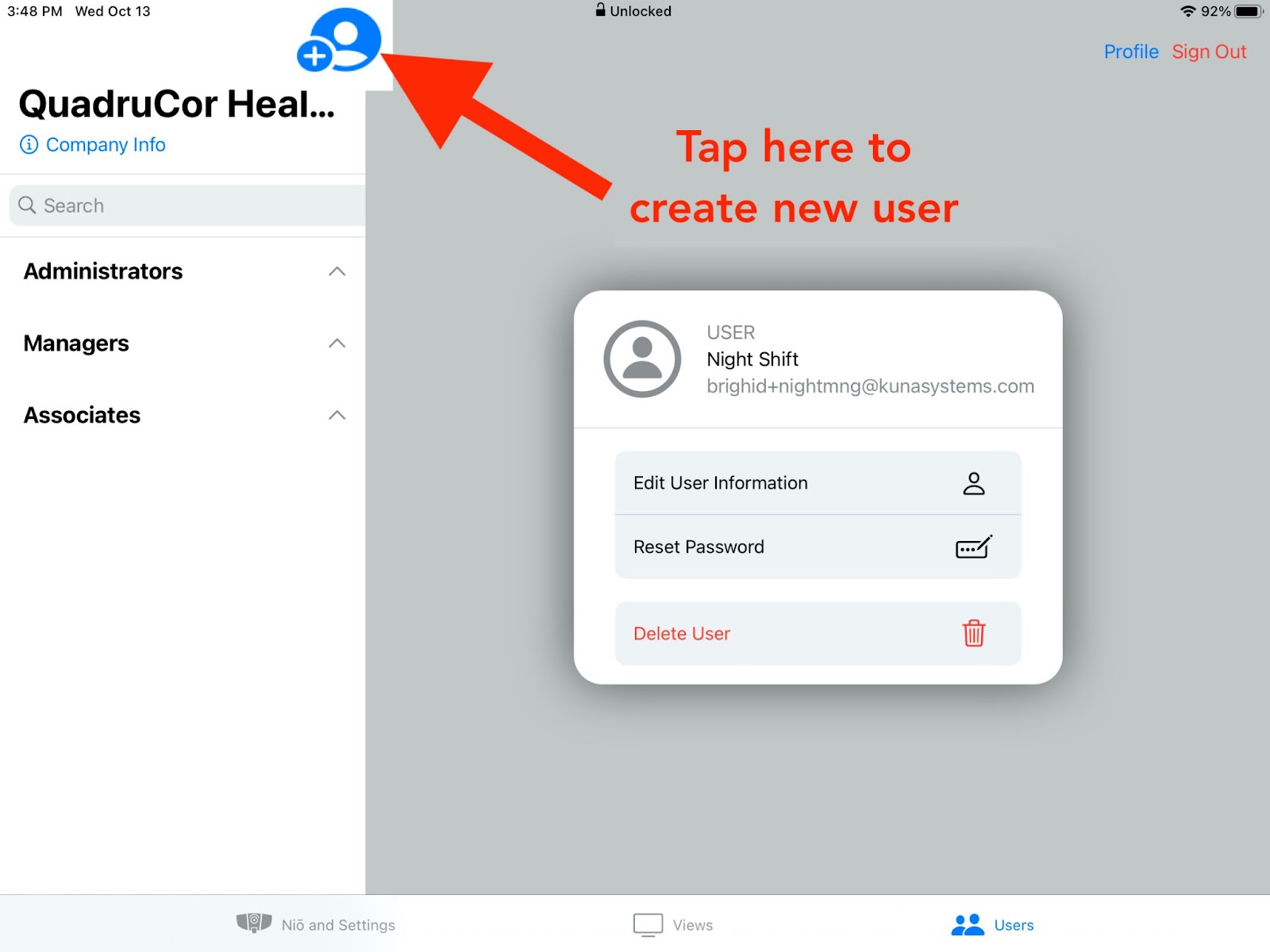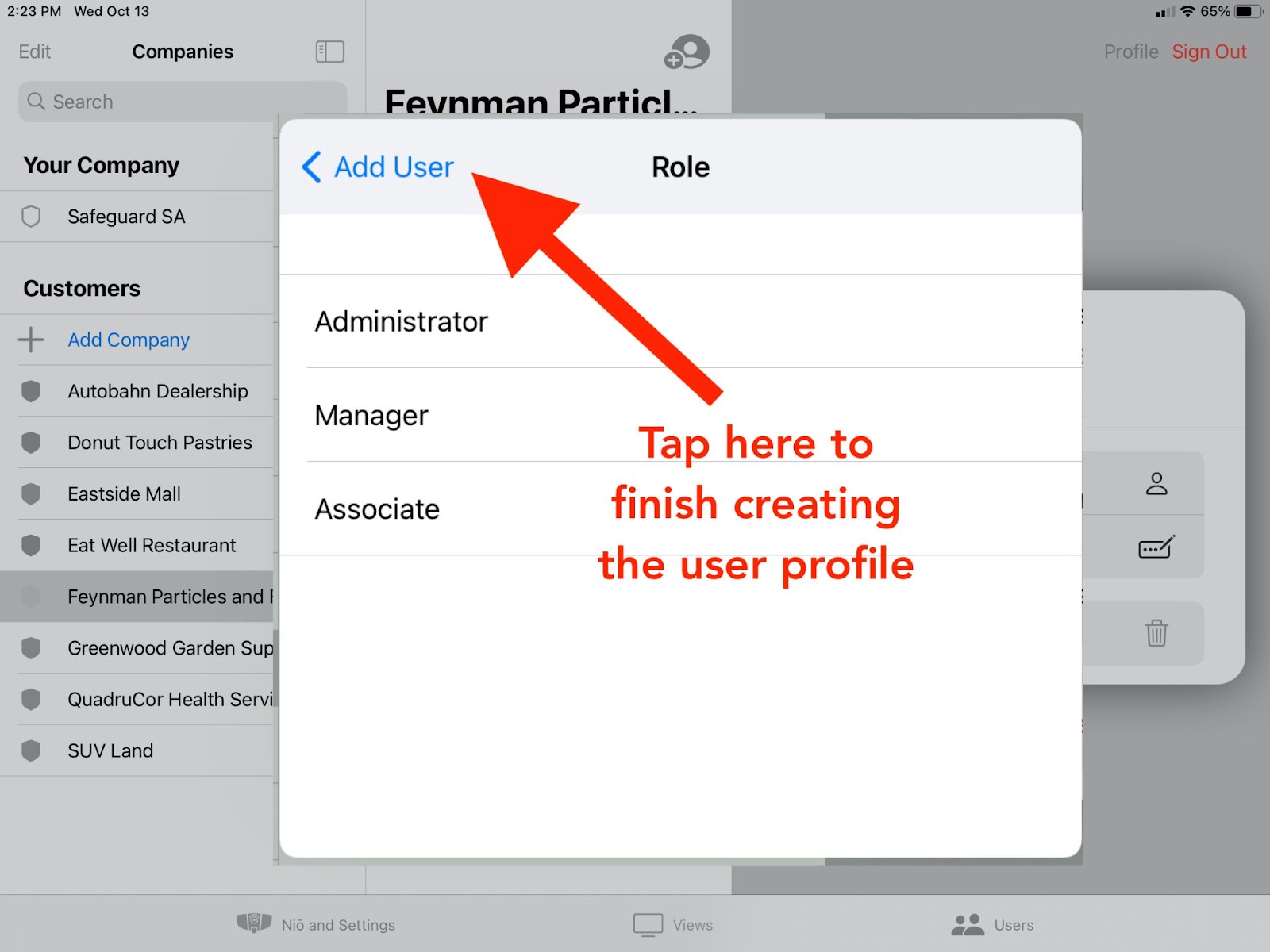 Tap ‘Role’ to select the level of permissions the new users will have. Select Administrator, Manager, or Associate. Tap “Add User” to set up the role and return to the user profile. The user’s name and role can be easily changed later. Note: The first Company Administrator role can only be created by a Security Agency Administrator.