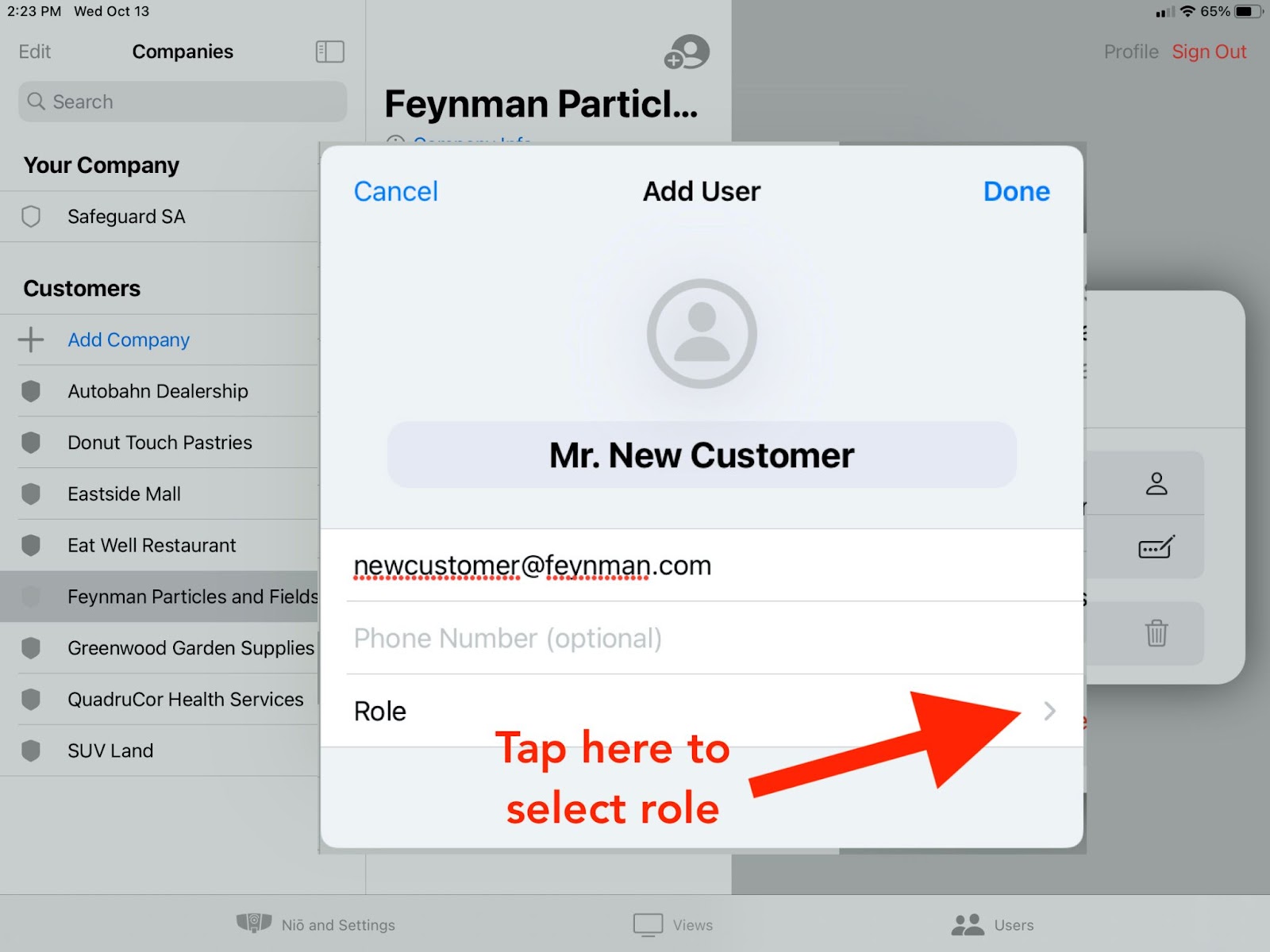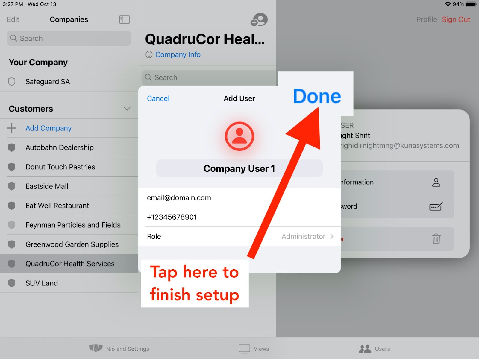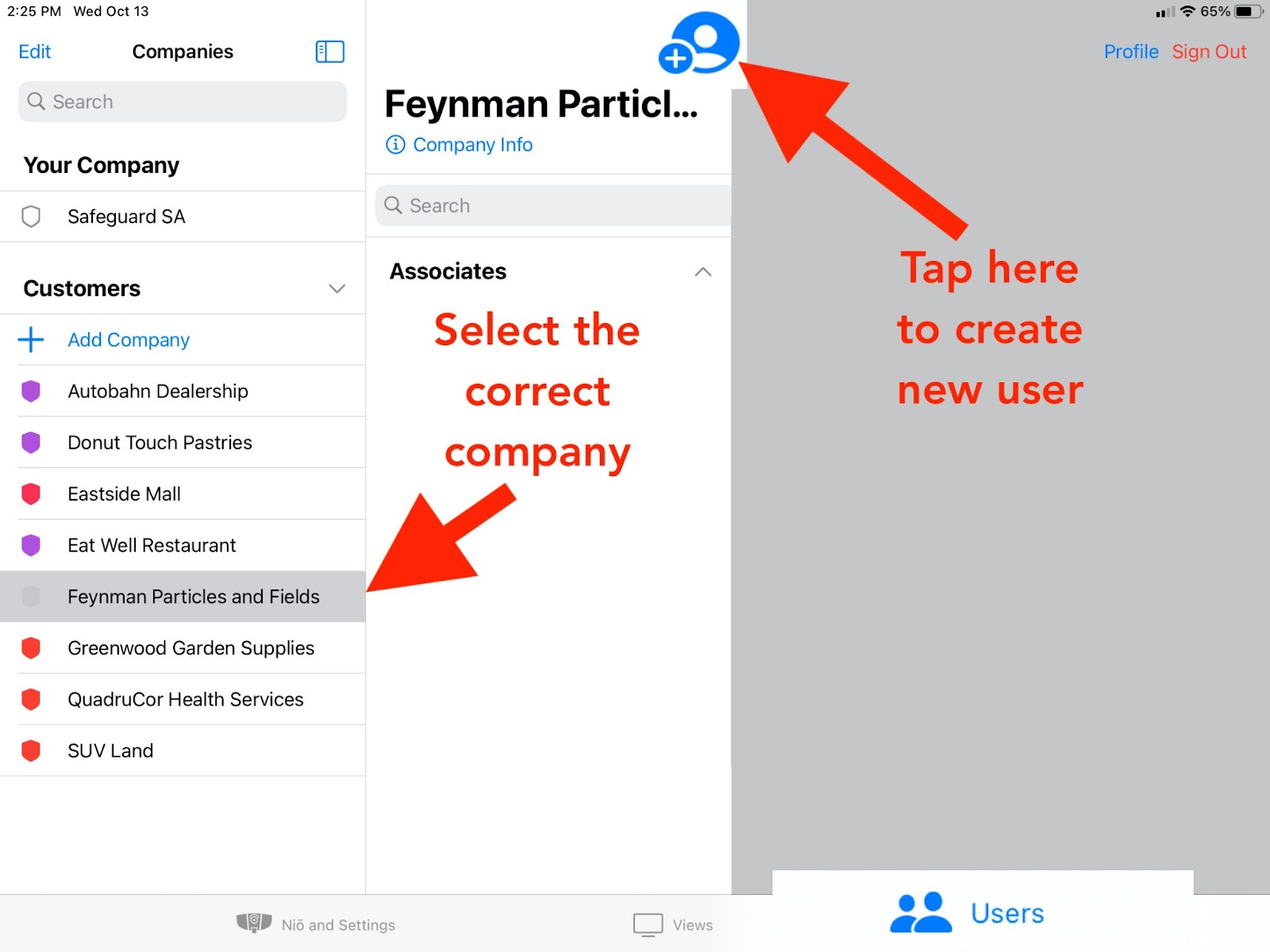 Security AgencySelect the Users tab on the iDter app.Tap the name of the company to which you wish to add a user. Make sure the correct company is highlighted. Tap the “Add User” button. | CompanySelect the Users tab on the iDter app. Tap the “Add User” button. |