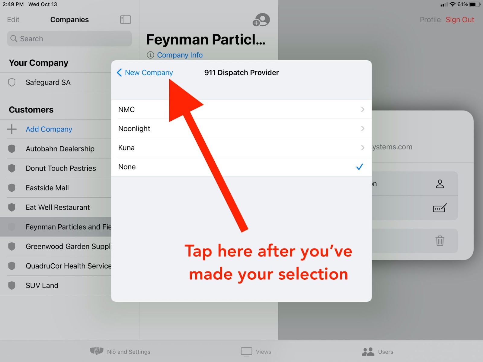 To benefit from the 911 dispatch service, you must have an agreement with iDter for this company. If you have been set up with a 911 provider, please choose it. If not, select None.